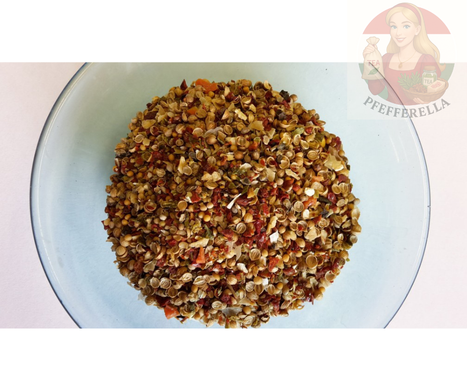 Beschreibung: Aromatische, dekorative Gewürzmischung mit farbenfrohen Paprikastücken, Pfeffer und Senfsamen. Verleiht Fleischgerichten nicht nur einen würzigen Geschmack, sondern auch eine ansprechende Optik.