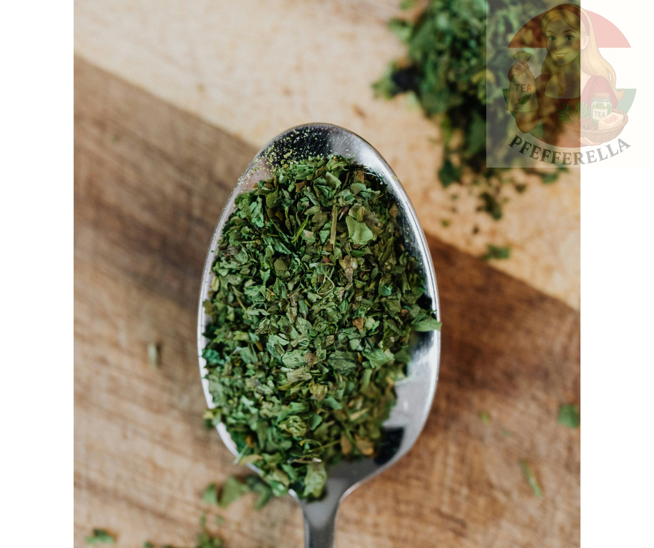 Fein getrocknete, graugrüne bis olivgrüne Blätter mit typischem, aromatischem Duft.