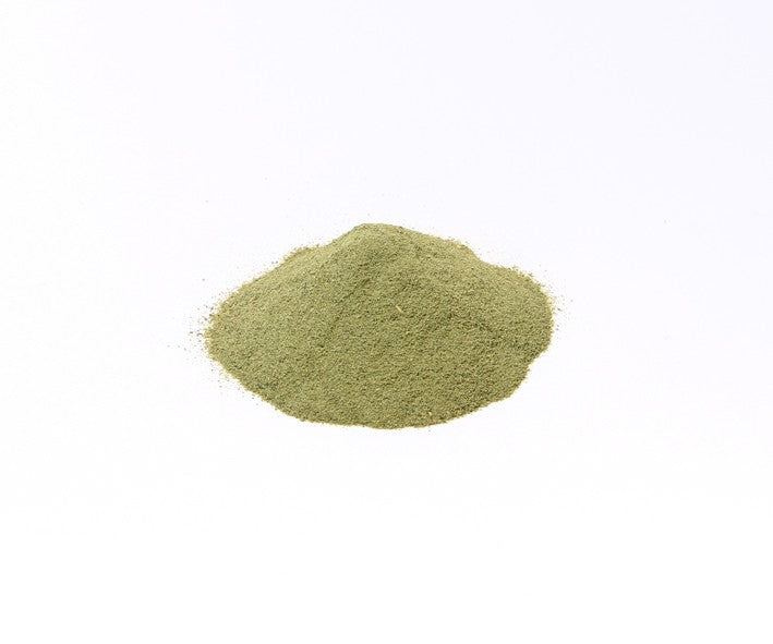 Feines, gleichmäßig gemahlenes Pulver in olivgrüner Farbe.